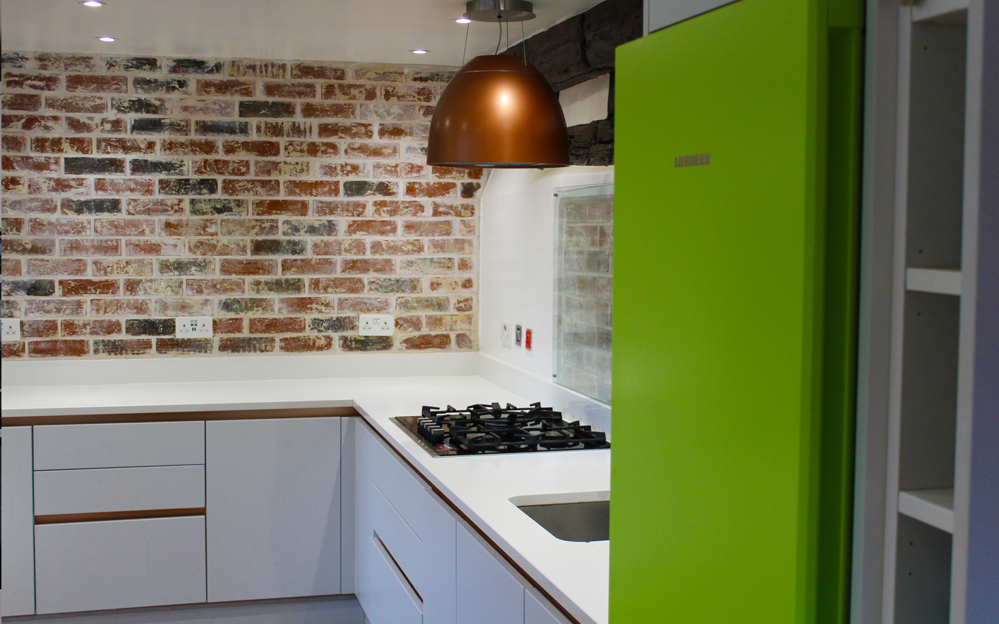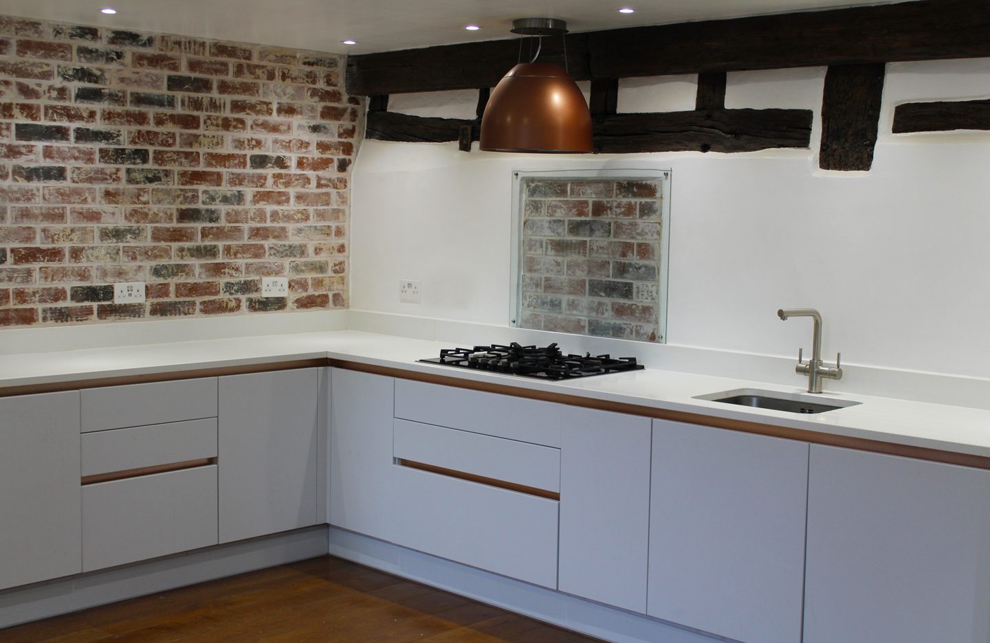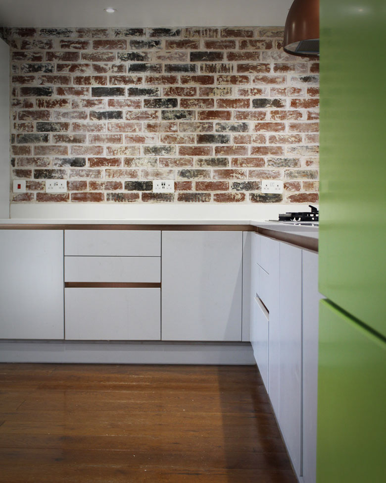 The project involved, renovation works within the space, kitchen installation, new flooring, skirting boards through-out, brick slip install, beam renovation and faux beam installation.
